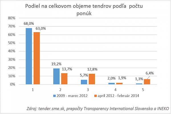 V nemocničných verejných obstarávaniach sa stále málo súťaží. V sledovanom období apríl 2012 – február 2014 použili nemocnice z celkového obstaraného objemu (525,6 mil. EUR) až 63% (331 mil. EUR) v tendroch, kde ponuku podal iba jeden uchádzač. Ide len o zanedbateľné zlepšenie oproti predchádzajúcemu sledovanému obdobiu (január 2009 – marec 2012), kedy nemocnice v tendroch s jedinou ponukou rozdelili 68% zdrojov (pozri Graf 1).