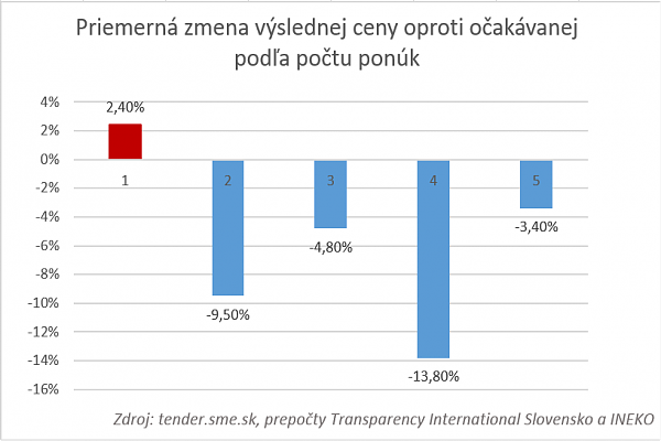 Graf 2: Jedna ponuka v tendri prináša nárast ceny, viac ponúk pokles